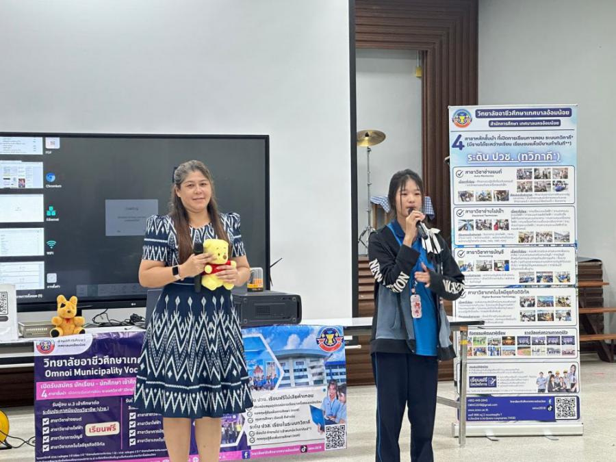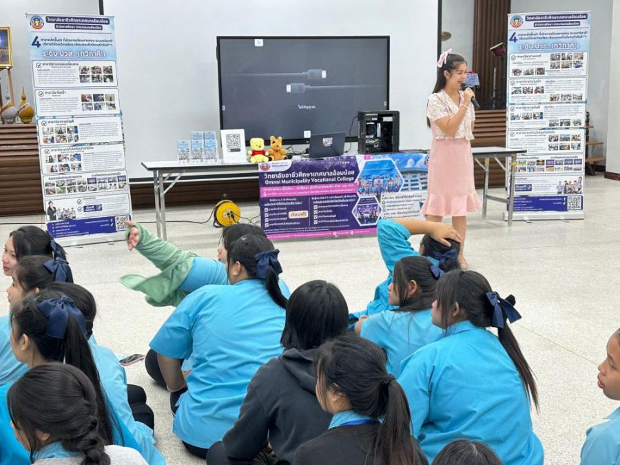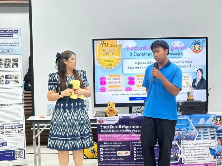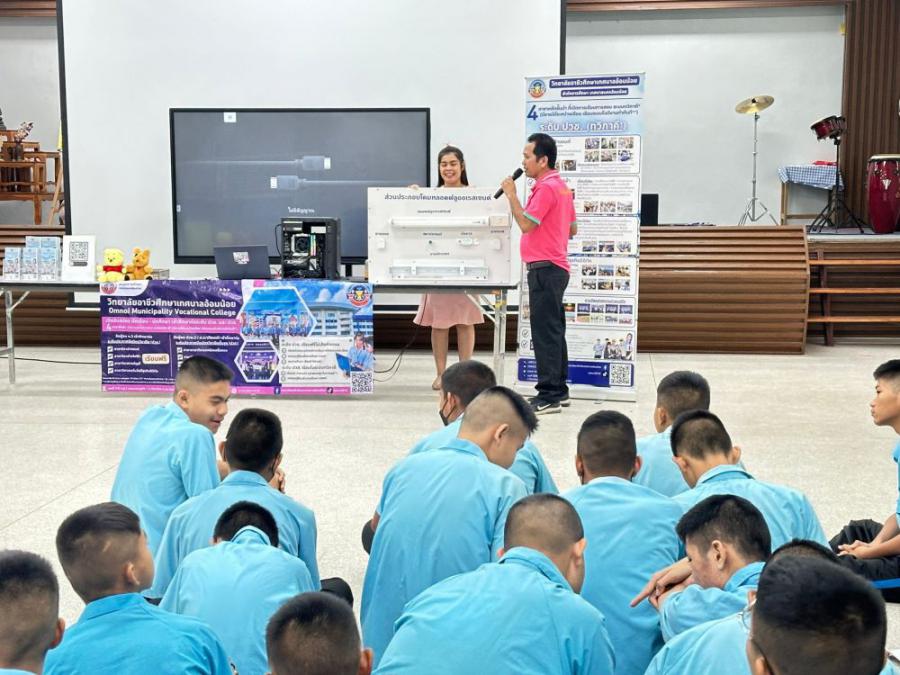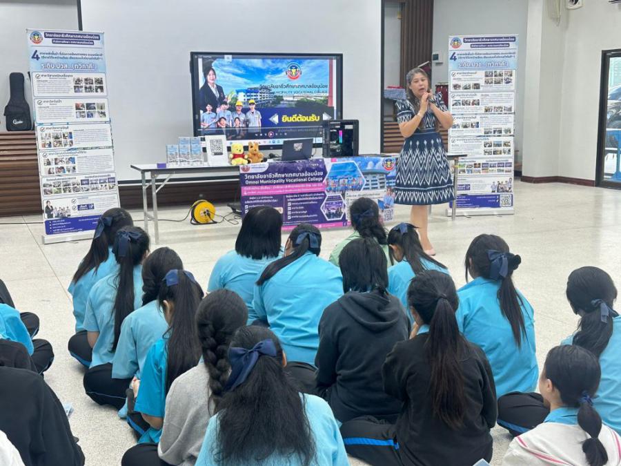 วิทยาลัยอาชีวศึกษาเทศบาลอ้อมน้อย โดย นายณรงค์ จันทะธรรม ผู้อำนวยการสถานศึกษา มอบหมายให้นางสาวพิมลมาศ สุทธิสอาด รองผู้อำนวยการสถานศึกษา พร้อมคณะครูแนะแนว เข้าแนะแนวศึกษาต่อระดับมัธยมศึกษาปีที่ 3 ณ โรงเ